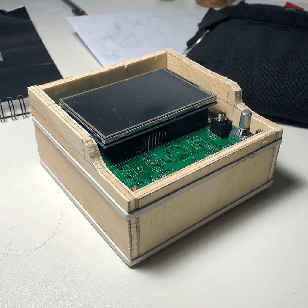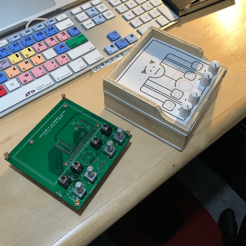 The final assembly is 3 PCBs deep – the raspberry pi, the i_n_c_u_r board, and my faceplate – with the pi screen on top. I assembled everything with spacers and attached the whole thing to the bottom of the case with hot glue. This makes the final box look pretty cool, with only 4 little screws on the faceplate holding everything together, but it’s a hige pain in the butt to take apart to troubleshoot. Not only do you need to take apart all the laters to get to the pi at the bottom, but the spacers are extremely close to the edge of the enclosure which makes screwing them in and out really cumbersome. The box is a simple plywood design, with a lot of sanding to compensate for my wobbly job cutting the side panels out.